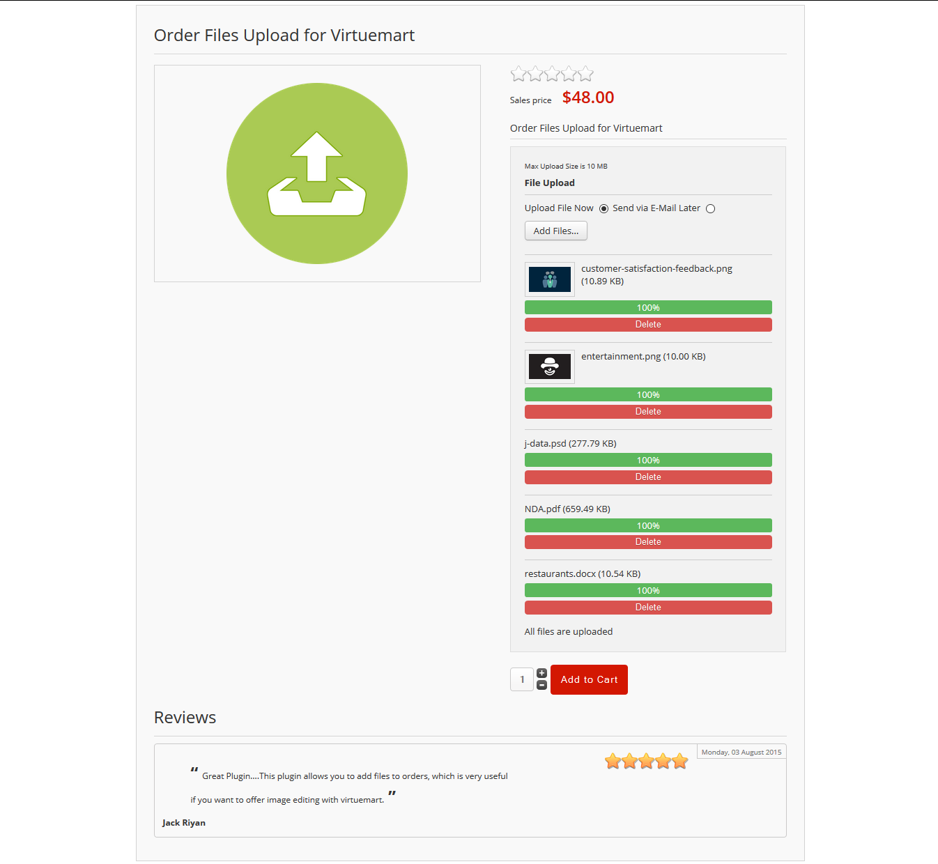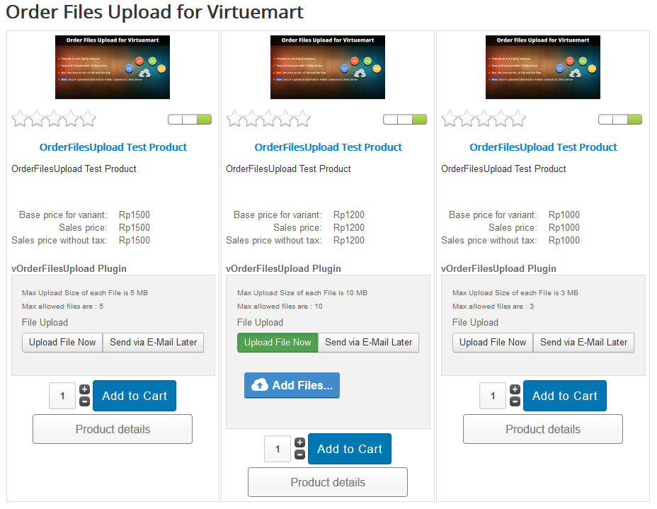 Many Virtuemart shop owners wonder "How to upload images or any type of files on Virtuemart product detail page". This is the solution for the problem. Order Files Upload for Virtuemart plugin is very easy to use, yet powerful and allows users easily and quickly to upload multiple images and files for their products with Ajax based.