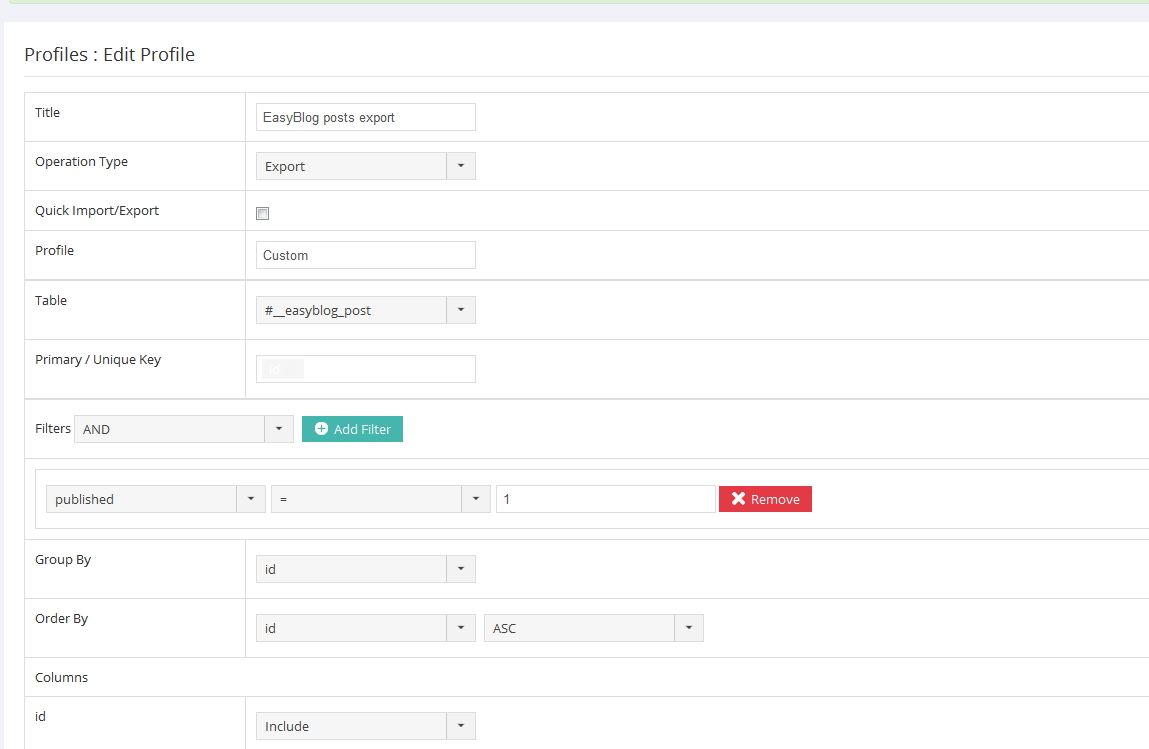I created a profile, easyblog post export, and I tried to add a new filter in the profile, that is 'published=1', but I get error message '1052' on the front-end.