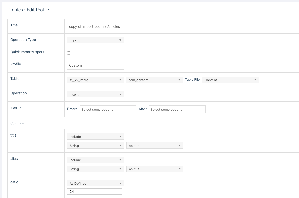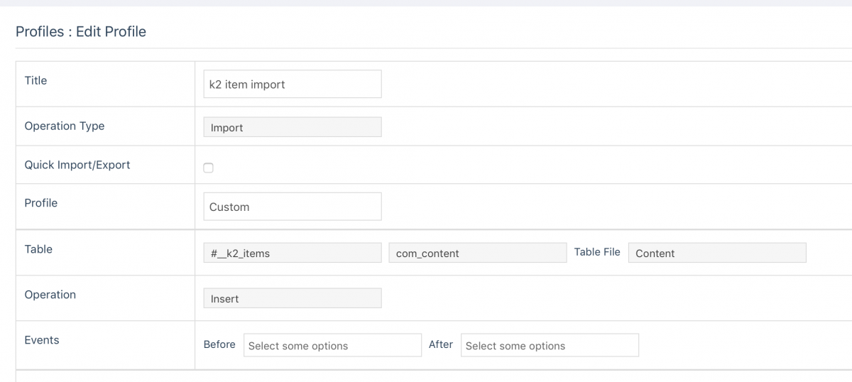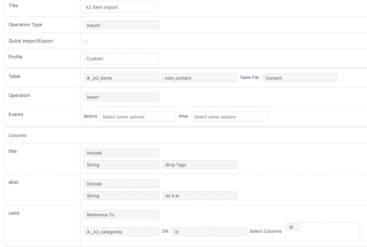 Below is a screen capture of the top part of the k2 item import profile on the Joomla 3.5 site.