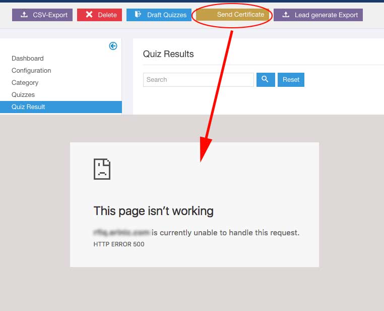 Most probably the issue is caused due to the mismatch in the certificate HTML as the pdf converter has a strict standard for the HTML input. Please check the certificate template HTML for any mismatch tags.
