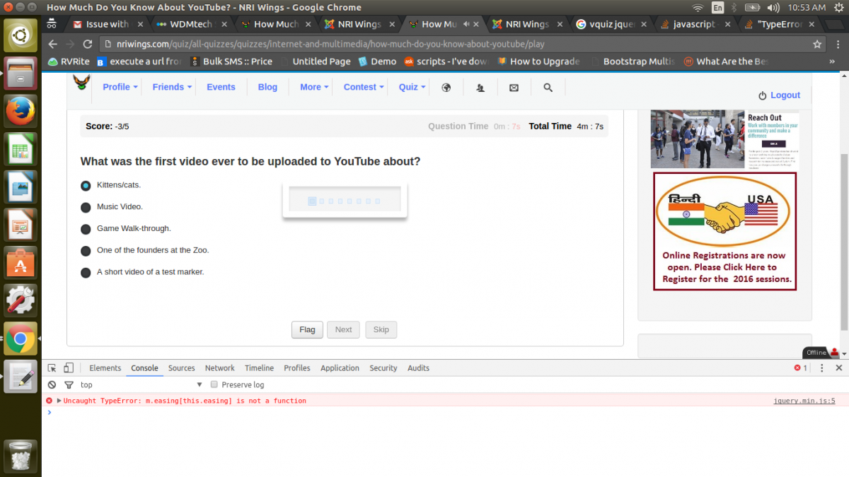 I take a quiz and start , for question 1 i select answer then click on next button then progress bar show only don't go to second question. In console it's showing error "jquery.min.js:5 Uncaught TypeError: m.easing[this.easing] is not a function". I attached a screenshot.