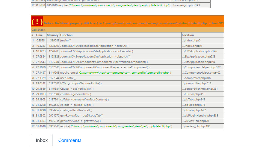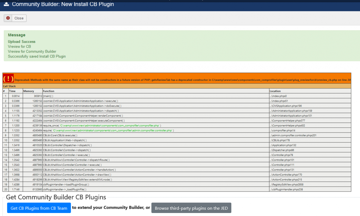 Therefore, I have installed pkg_vreview1.9.12.zip through !Joomla extensions installer and plug_vreview_cb1.0.2.zip through CB plugin management and when I login in CB through the front-end, I get attached messages.