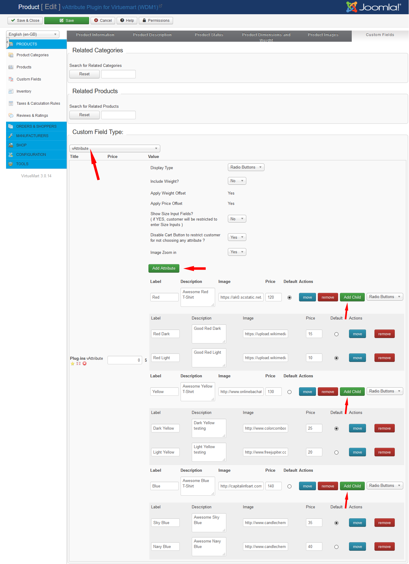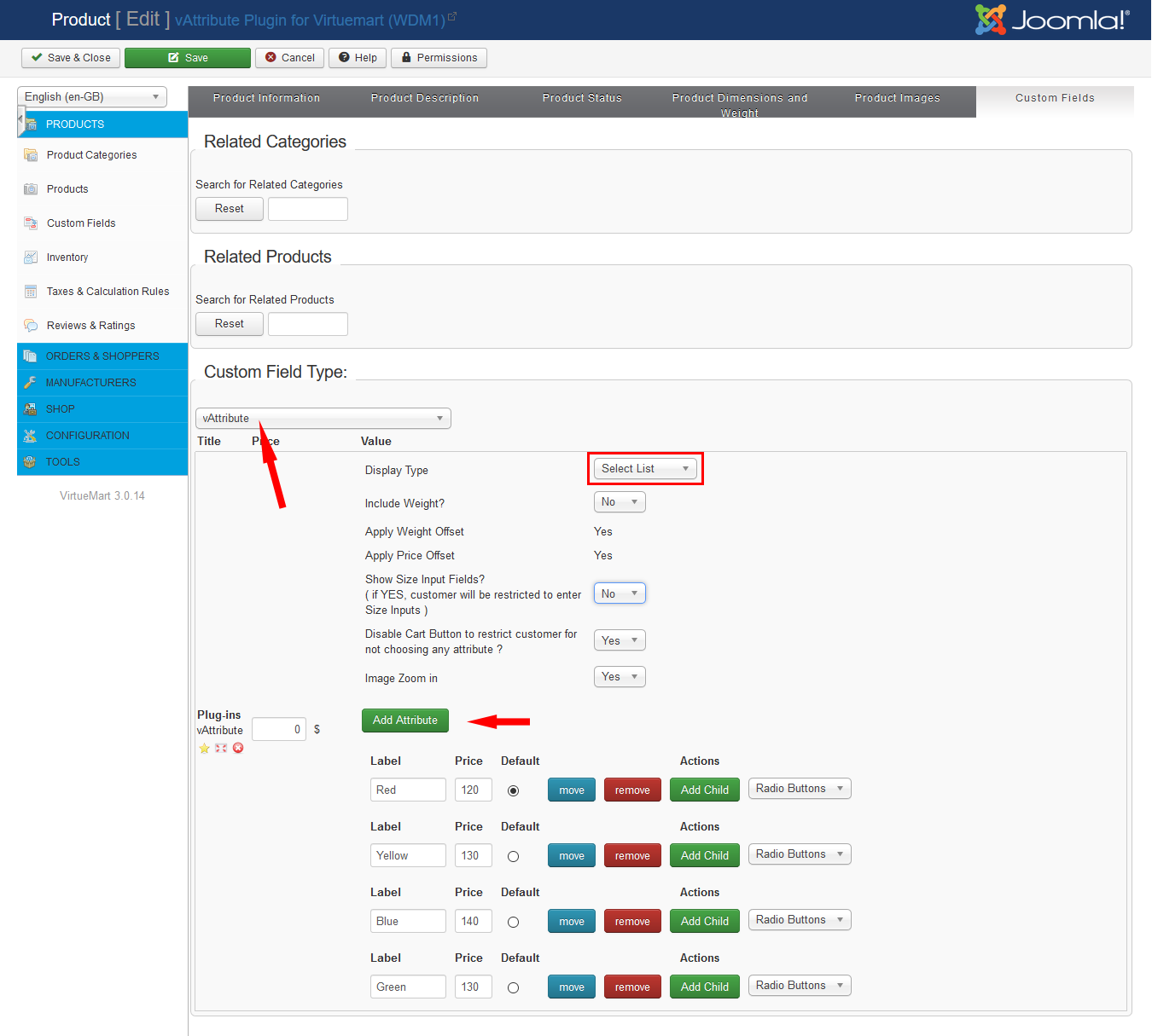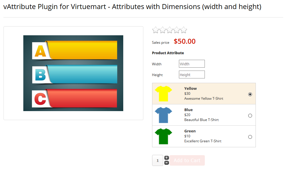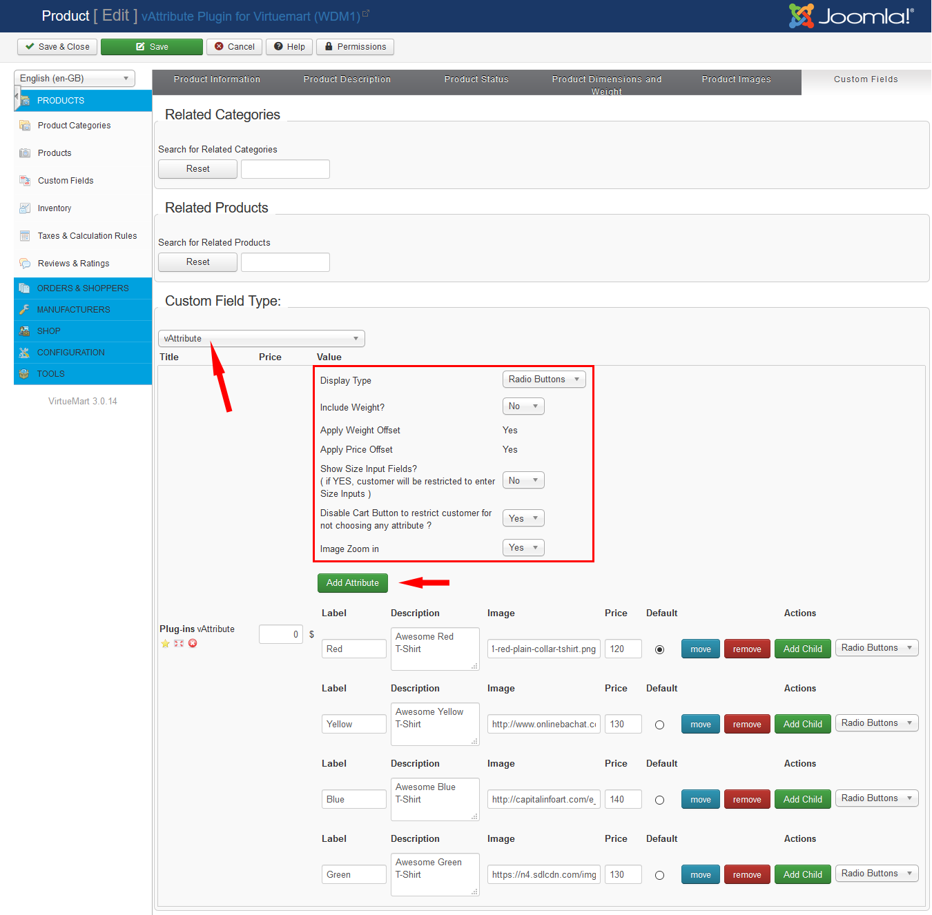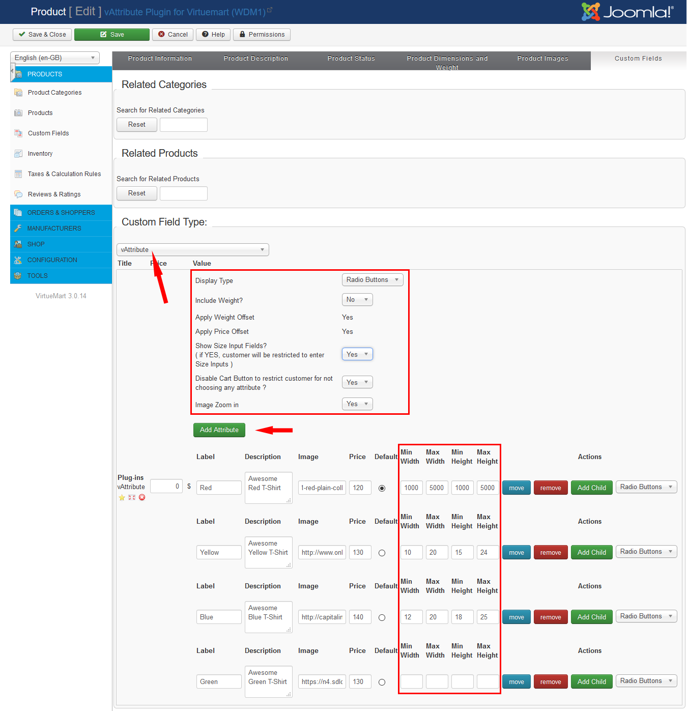 vAttribute Plugin is a Virtuemart Custom Field Plugin that allows the admin / shop owner to add a different attribute like Title, Description, Images, Weight as well as Prices for each attribute separately. It also provide the ability to calculate price per Square Unit based on the dimensions (width & height) given by the customer. It also allows you to arrange your attributes via drag n drop in very easy way. Also you can set the limit for the dimensions (width & height) and can set an attribute as a default attribute. It also allows you to update main product weight based on the dimensions (width & height) or chosen attributes by the customers.