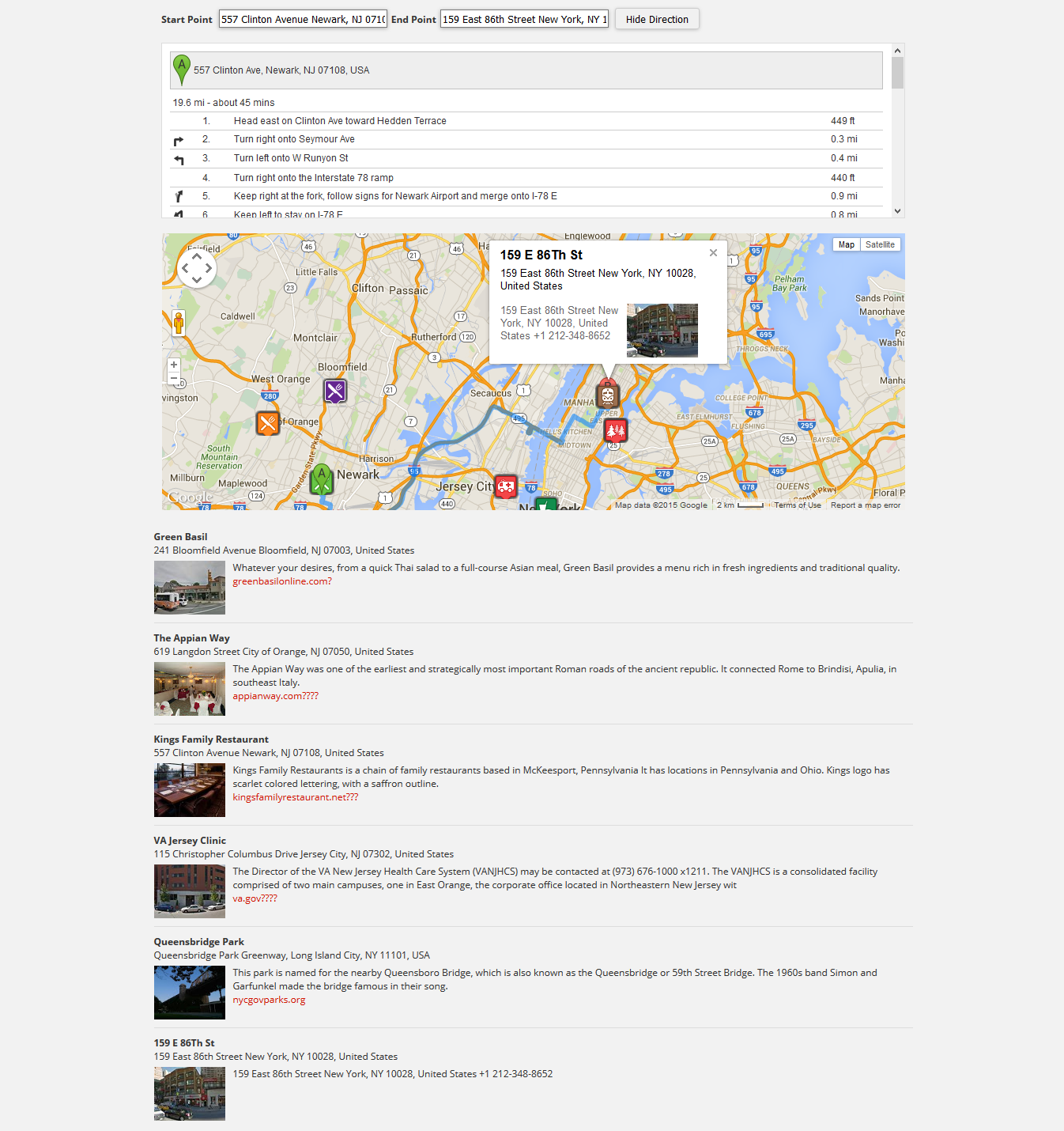 - A10. Direction feature will allow the user to get directions from one place to another. It will display two text boxes to let the user enter the start and end point and get the direction between them. User can easily get directions to a particular marker on Map, just click on a marker and End point address gets automatically filled up.