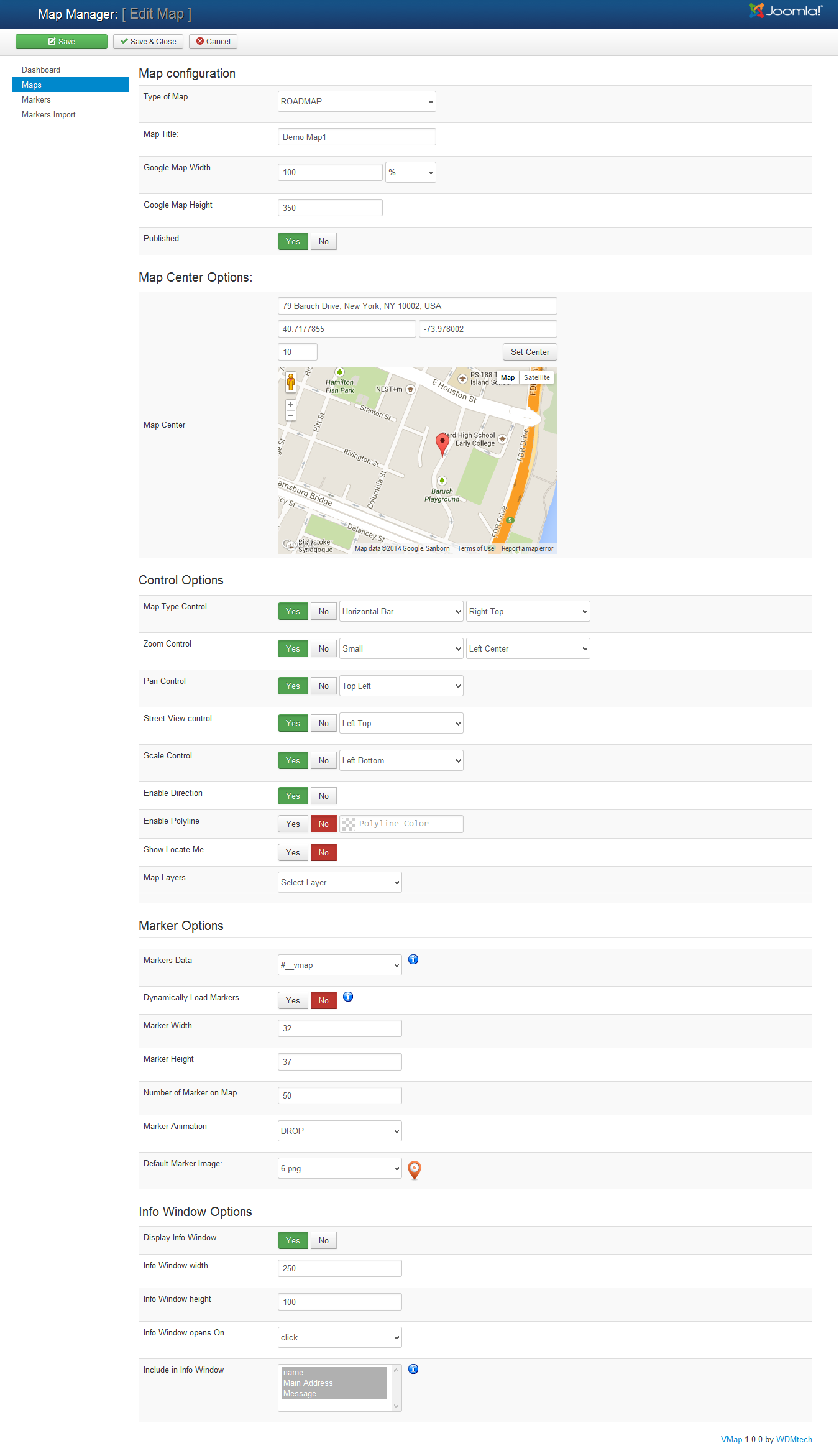 - Ability to Configure most of the control options (Pan Control, Street View control, Rotate Control, Overview Map Control, Scale Control, Info window width and height control, Display infowindow control, Zoom Control, Zoom Control Positions, Map type control, Marker width and Height control).